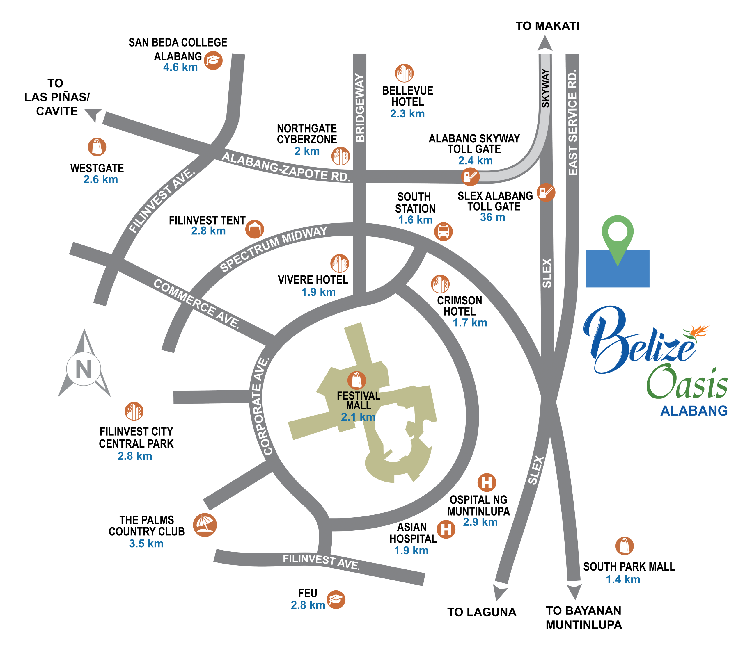 Belize Oasis enjoys a strategic location along the East Service Road in Alabang, Muntinlupa City, making it highly accessible via two major thoroughfares: the South Luzon Expressway (SLEX) and the Skyway.